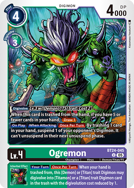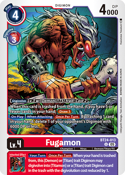 One effect shared by all of them is one that lets you draw a card when you trash a card from your hand. For [On Play]/[When Attacking] effects, Fugamon deletes mid-level Digimon, Ogremon stops the opponent’s attacks, while Hyogamon gives allies keyword effects that help with offense and defense. Since this latter one brings out Lv.4’s equal in power to what you trashed from your hand, it allows you to keep up the attack even early on.