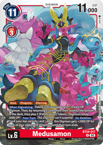 - 1. First, you’ll want to use [BT24-089 Unique Emblem: Blazing Conductor] to prepare Tamer cards while starting attacks with the Lv.5 Lamiamon. When your opponent’s security stack is removed from you can activate [BT24-001 Gigimon]’s inherited effect to Digivolve into [BT24-017 Medusamon]! Use this to play 2 Petrification tokens in your opponent’s field.