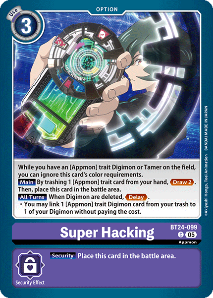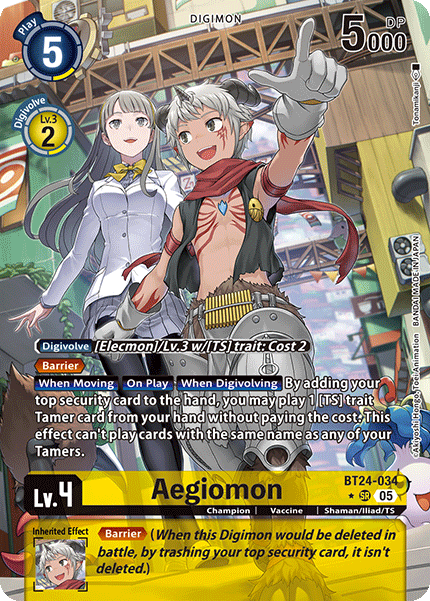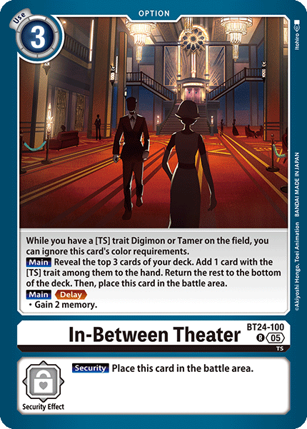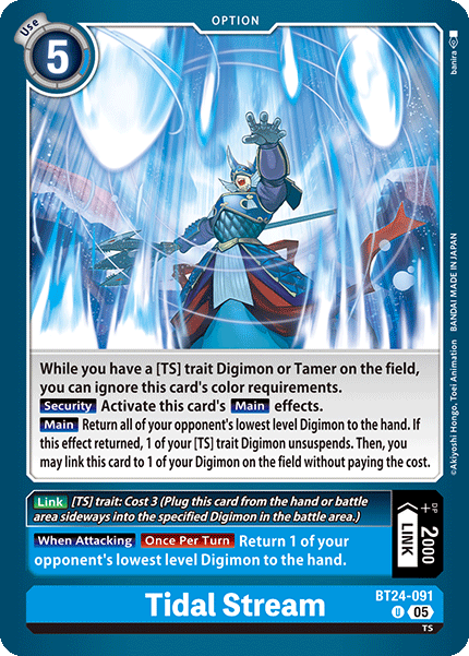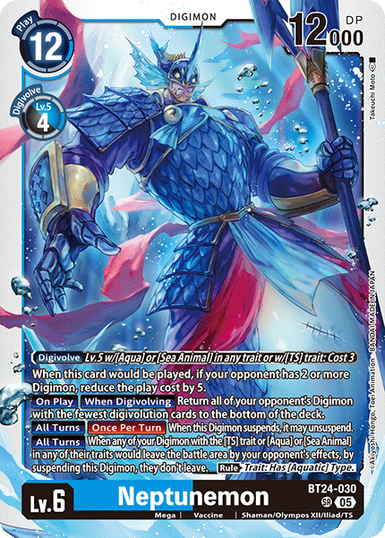 While placed in your security, all your Digimon with the [TS] trait or that are blue or yellow gain <Blocker>, and if Neptunemon or Venusmon are in play this powerful Option card also gives them <Alliance>! Keep up the attacks with the played small Digimon and [BT24-030 Neptunemon]’s effect to unsuspend them.
