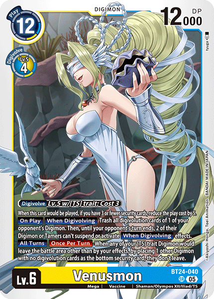 The [On Play]/[When Digivolving] effect also lets you wash away all the opponent’s Digimon with the lowest number of digivolution cards with a single wave! Aim to use it together with [BT24-040 Venusmon]’s effect that trashes digivolution cards.