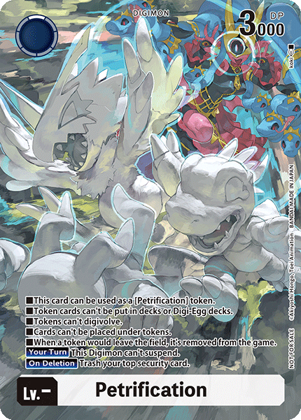 After deleting the opponent’s Digimon it returns 2 cards from their trash to the bottom of their deck and then plays 2 Petrification tokens! With this you’re able to delete their Digimon and return them to the bottom of the deck before any [On Deletion] effect can be carried out!