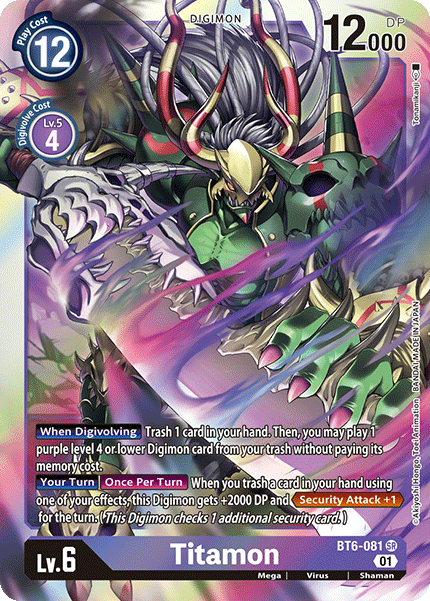 This deck battles using effects that trigger when cards are trashed from your hand. To play this deck effectively you’ll want to aim to play the trump card, [BT24-081 Titamon + SkullBaluchimon], using <Assembly>.